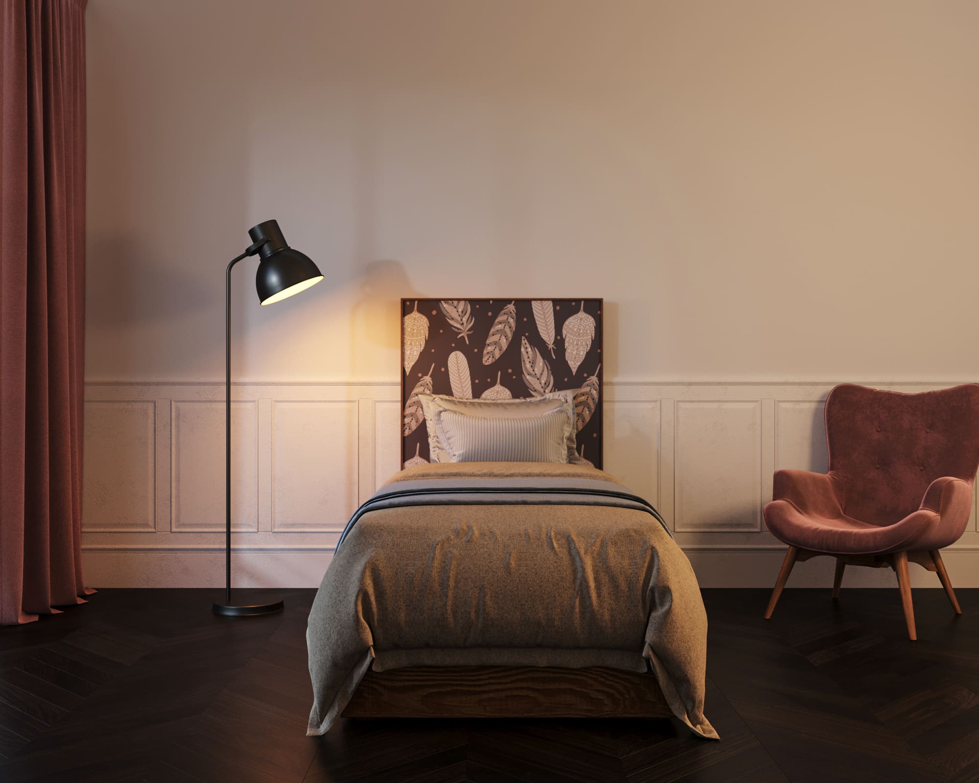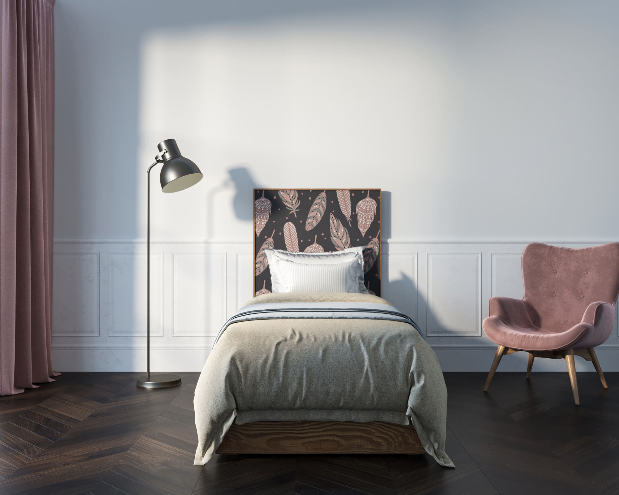 Оригинальная кровать "Berber" 90 на 200 выполнена в скандинавском стиле. Прямоугольный корпус изготовлен из ЛДСП и массива ясеня. Скандинавский дизайн с высокой спинкой, украшенной принтом, который можно выбрать из 49 вариантов, придадут свежесть композиции и  украсит интерьер спальни, оформленный как в современном, так и в классическом стилях.