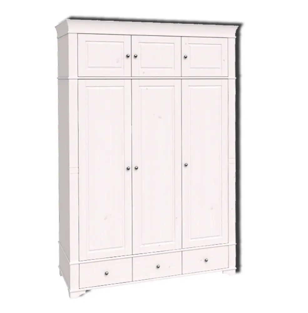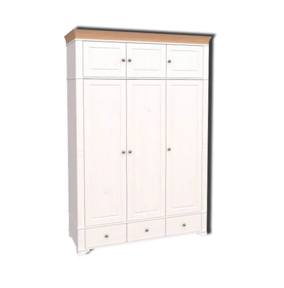 Антресоль для 3-х створчатых шкафов Бейли, имеет три дверки с двумя отделениями. Левое отделение широкое с 2-мя фасадами, правое узкое с 1 фасадом. При установке на шкаф Бейли карниз шкафа переставляется на антресоль, общая высота шкафа с антресолью составит 2450 мм.
