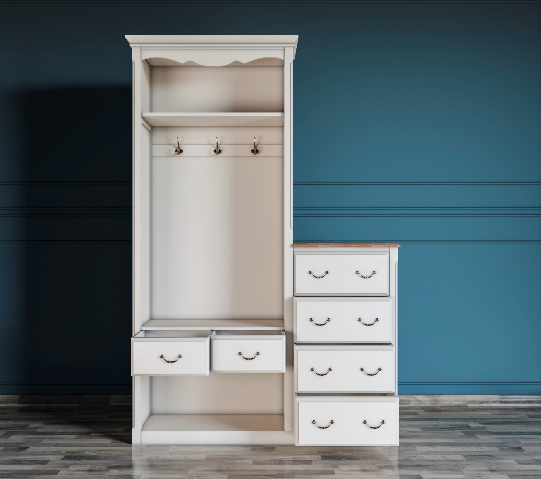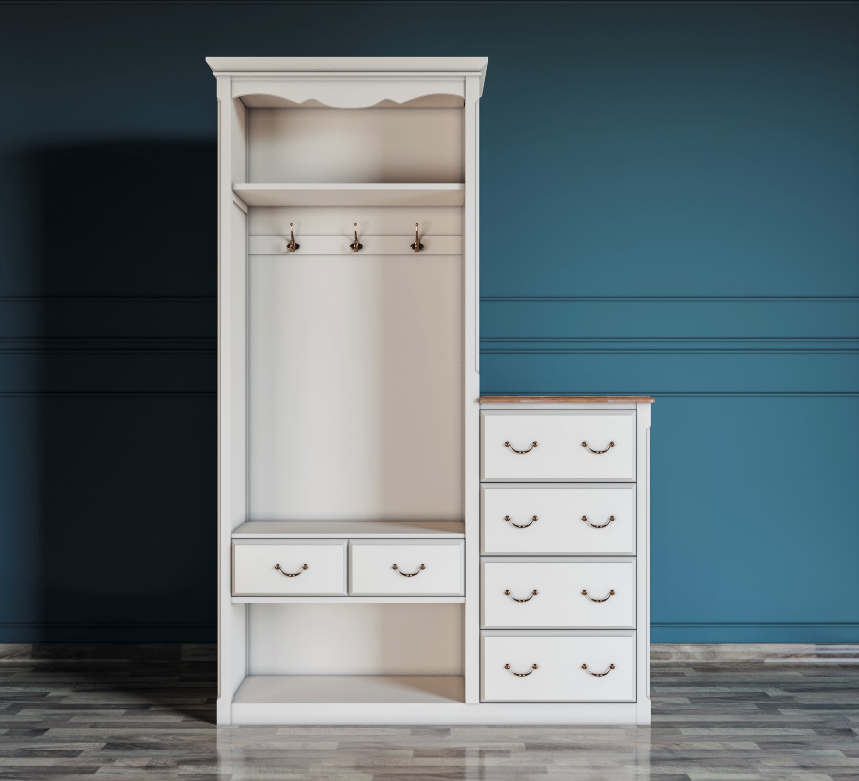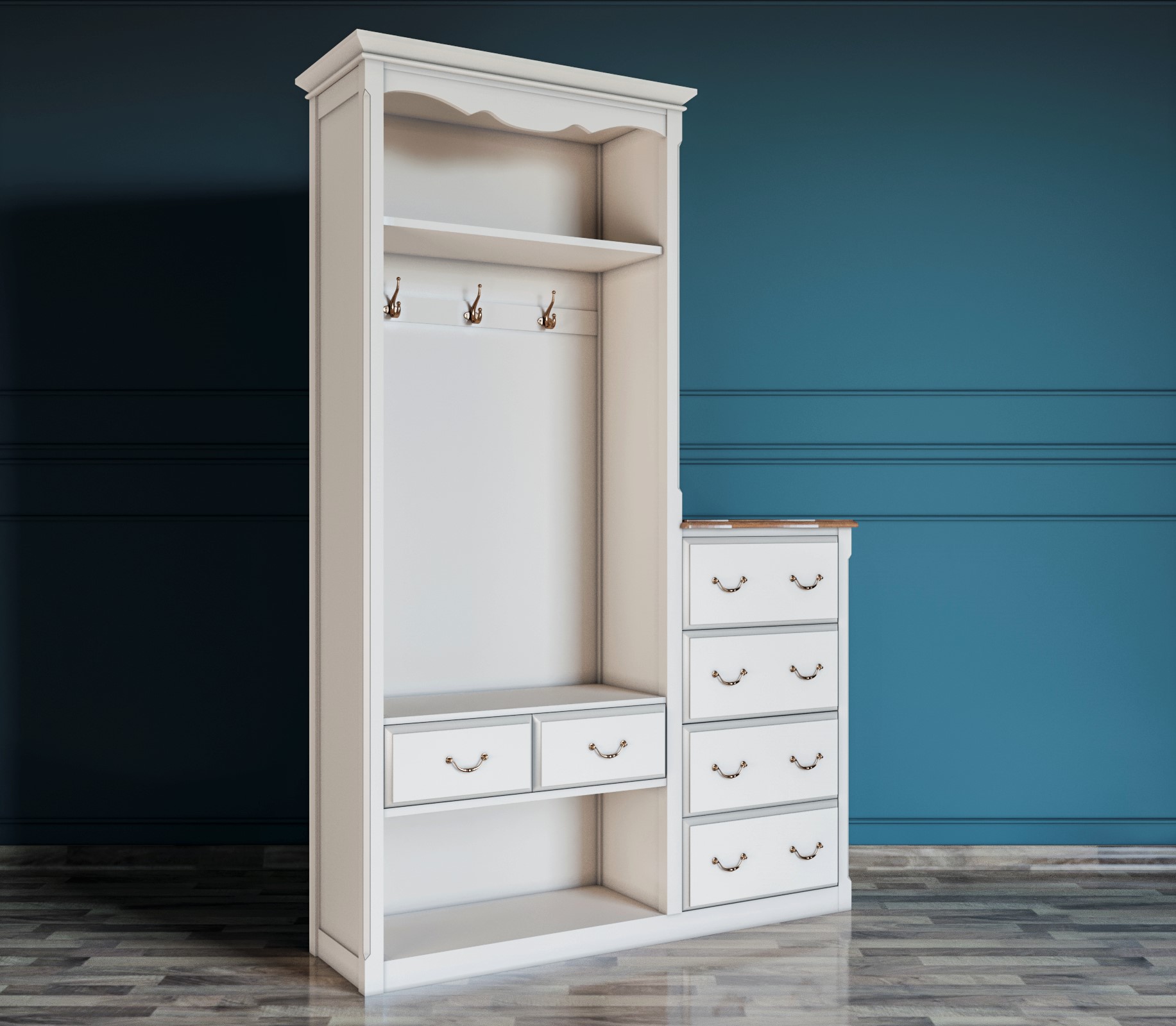 Наполнение: длинная шляпная полка, а под ней 4 крючка.