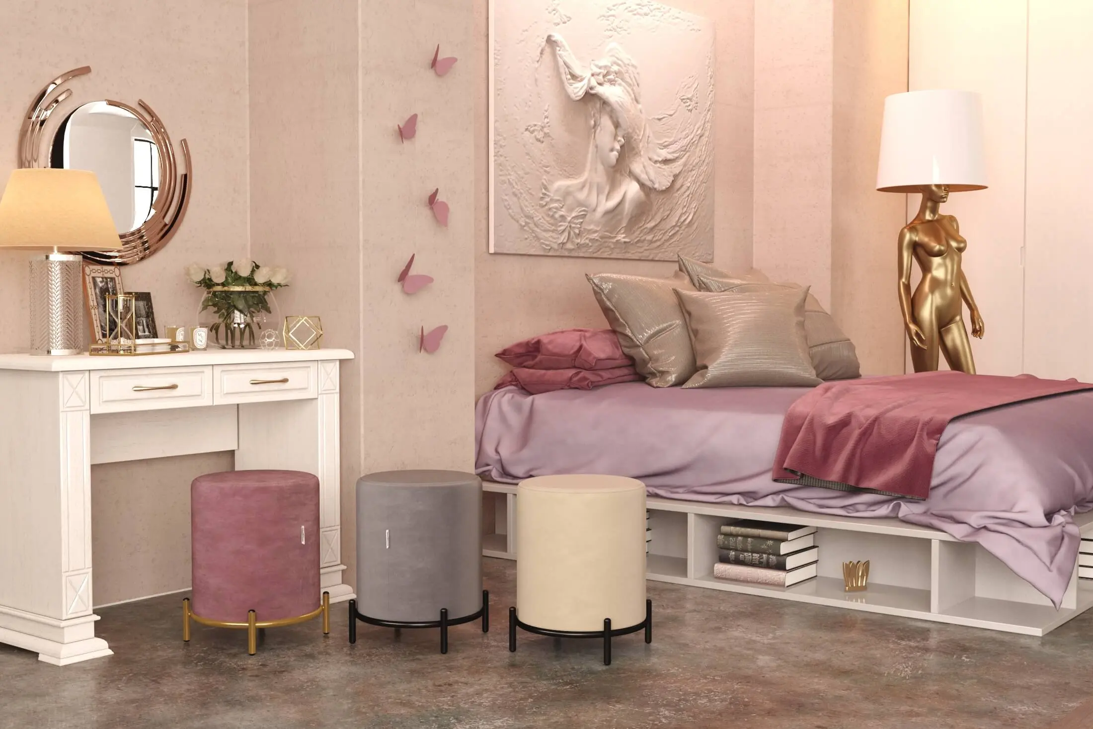 Нежный пуф цилиндрической формы добавит уюта и разбавит Ваш интерьер. Главное украшение – тонкие ножки из металла. Надежность металла и мягкость ткани прекрасно сочетаются в готовом исполнении пуфа.